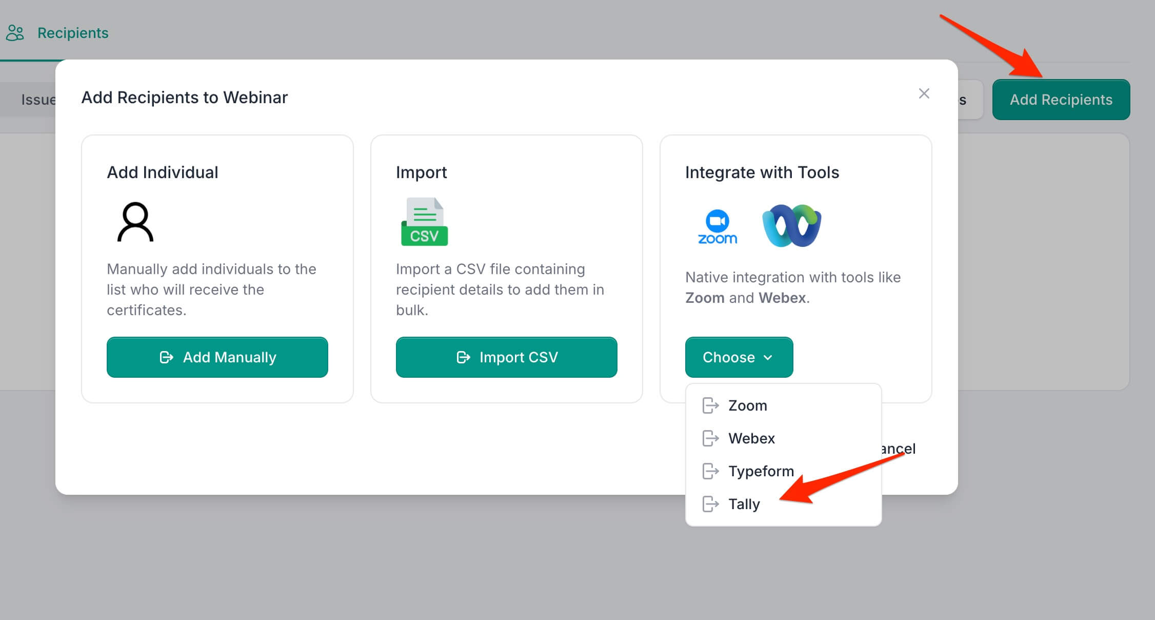 - Click Add Recipients and select Integrate with Tools, then