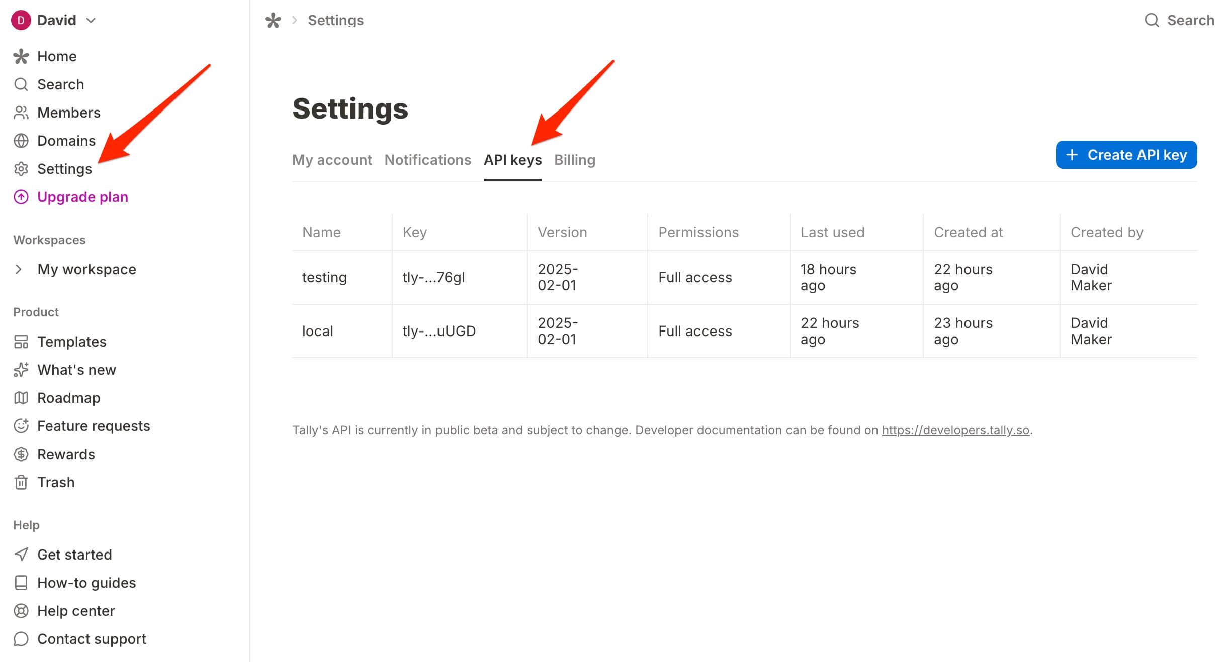 - Need help finding your API key? Click the documentation link or visit Tally's API documentation.