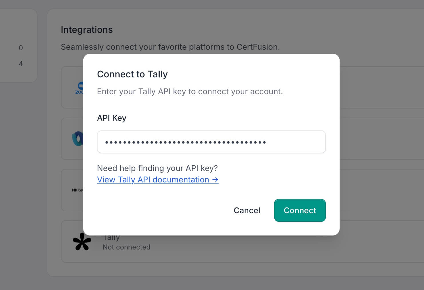 - Enter your Tally API key in the modal that appears. You can find your API key in your Tally