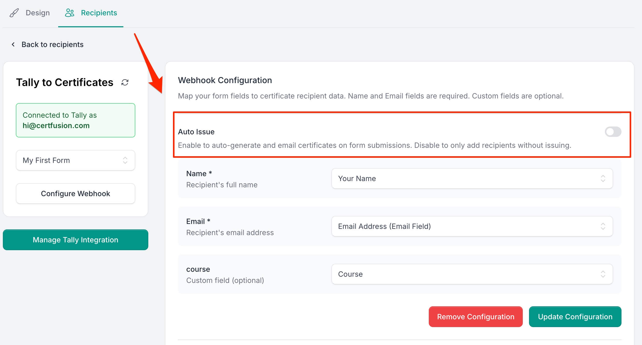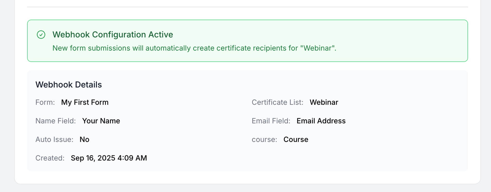 Once configured, new form submissions will automatically create certificate recipients. If auto-issue