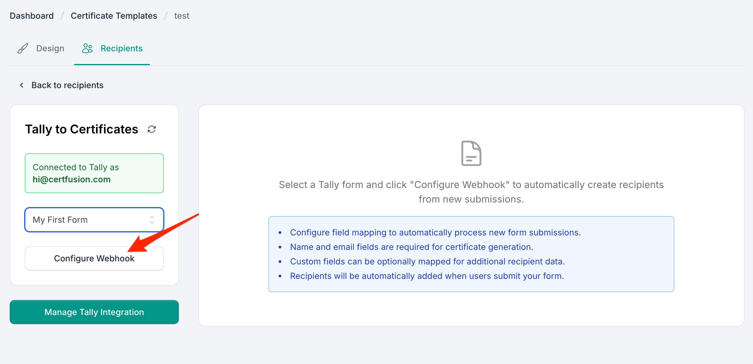 - Return to the Tally integration page for your certificate template