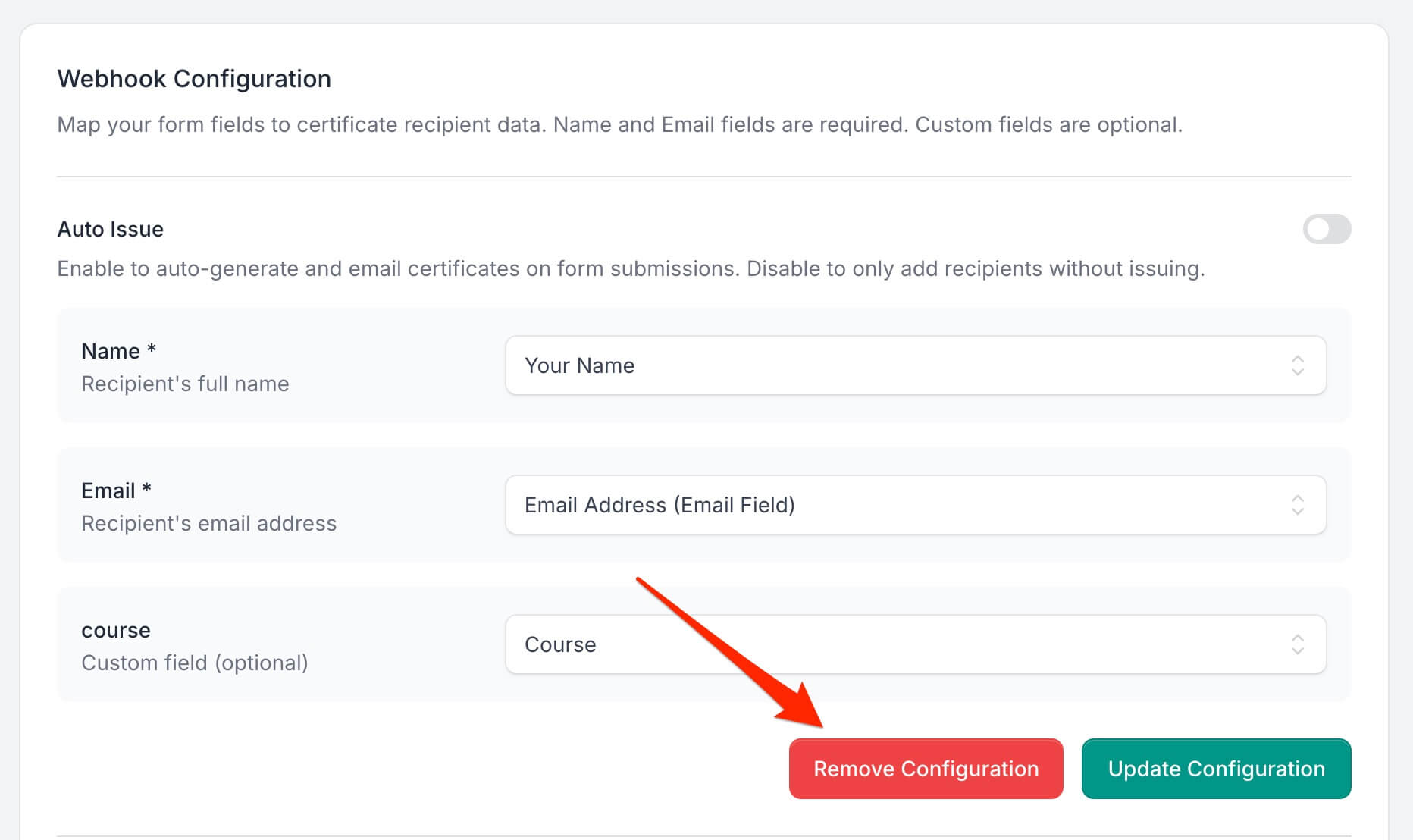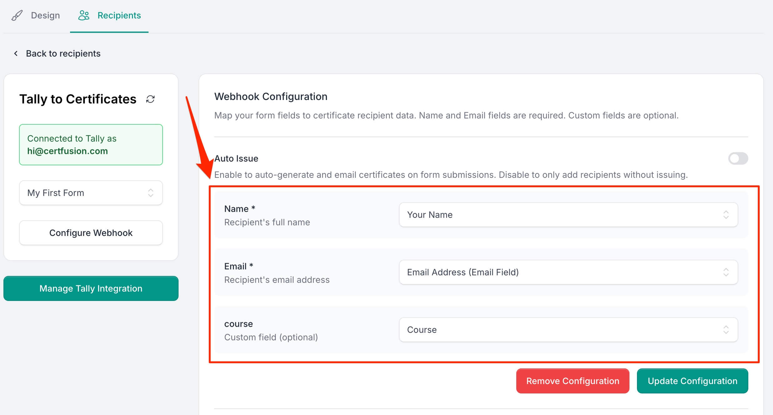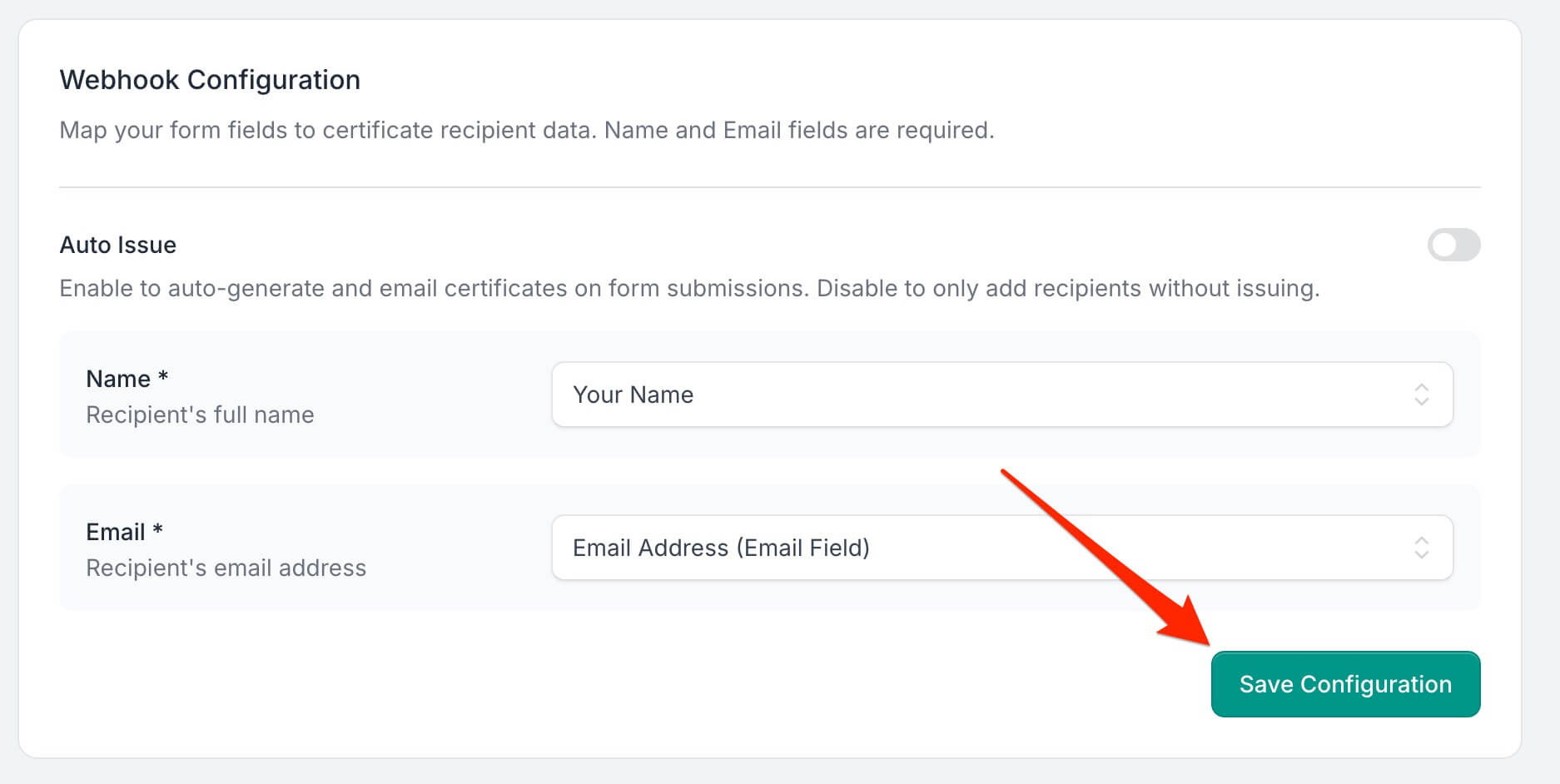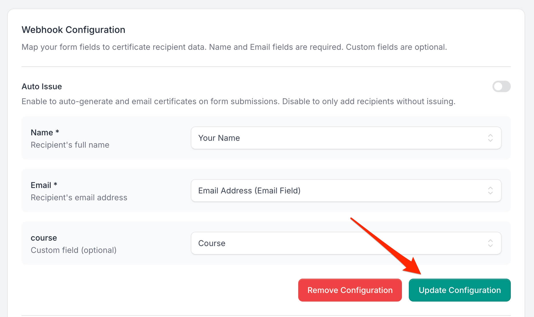 - Map your form fields to certificate recipient data: