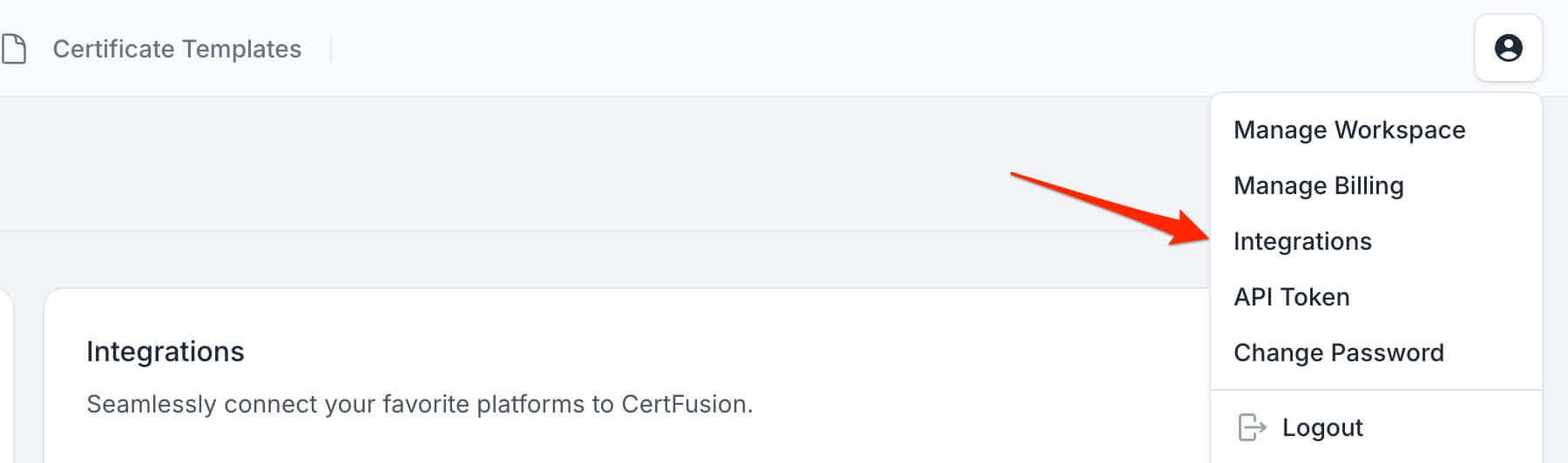 - Navigate to the Manage Integrations page in your CertFusion dashboard.