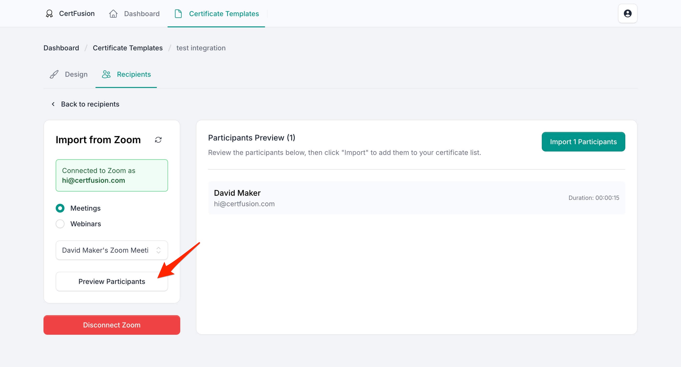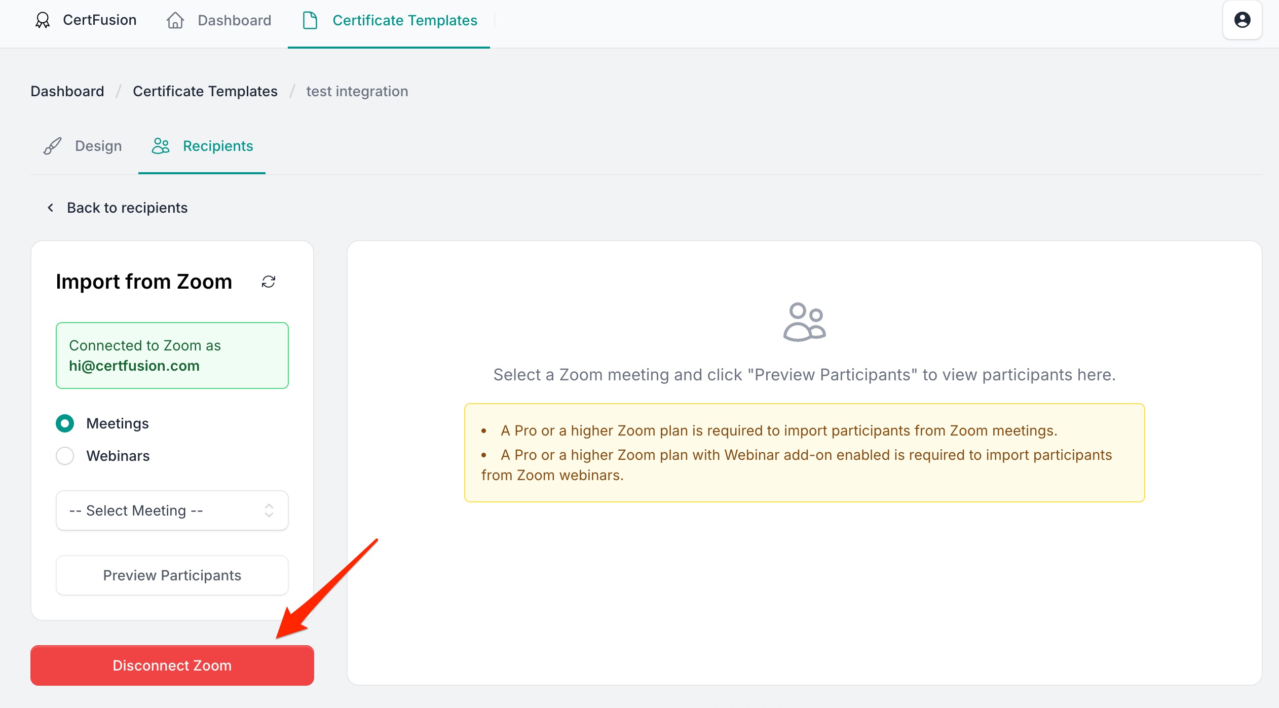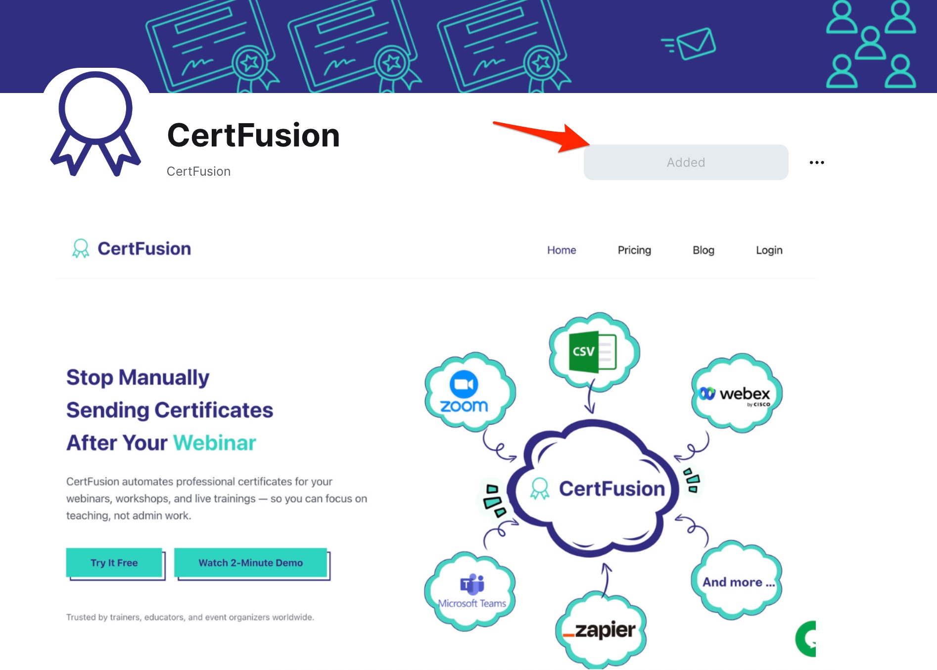 Connect your Zoom account to CertFusion and automate certificate delivery for your webinars and meetings. This guide walks you through installing the app, importing attendees, and removing the integration if needed.