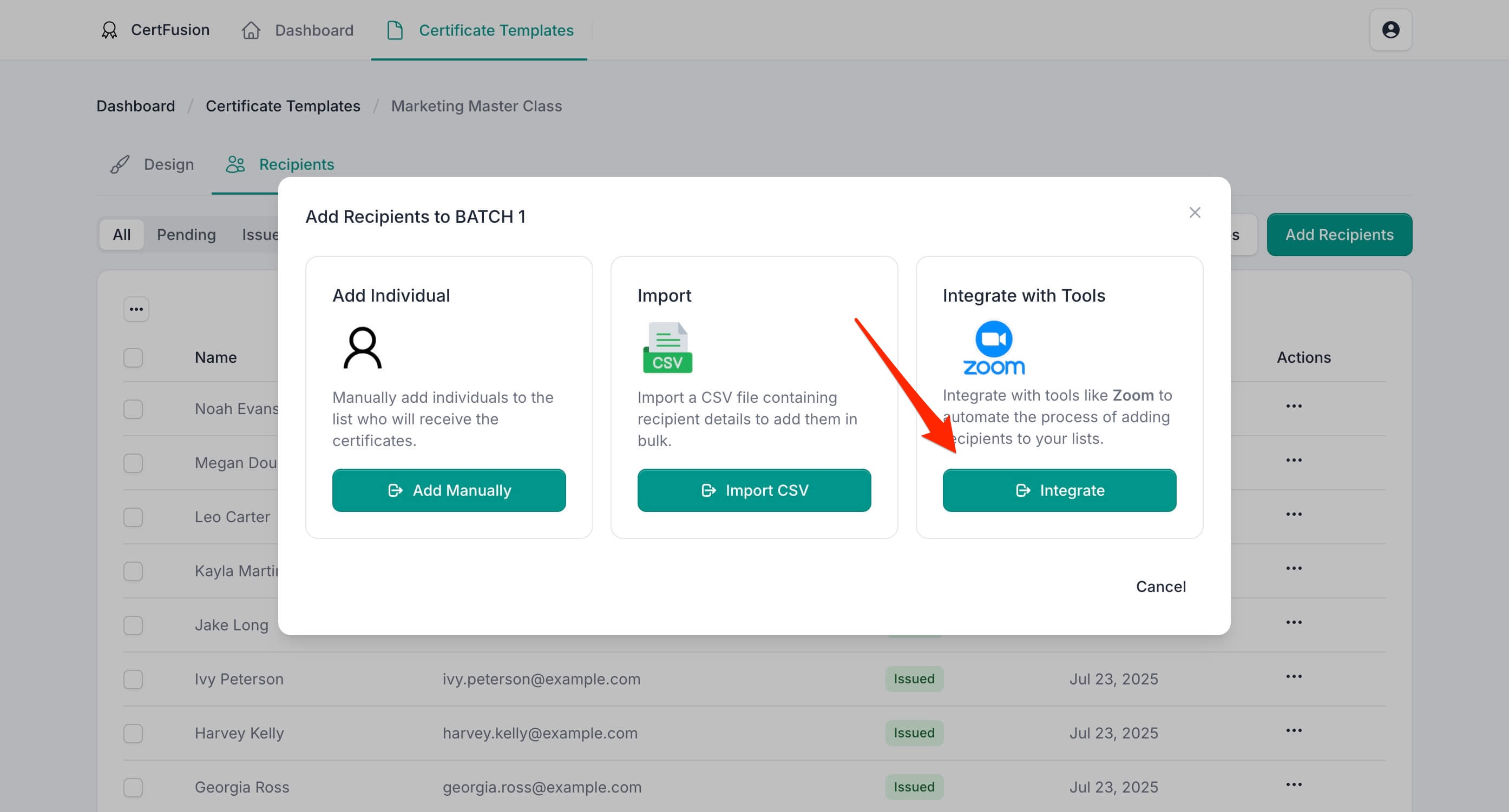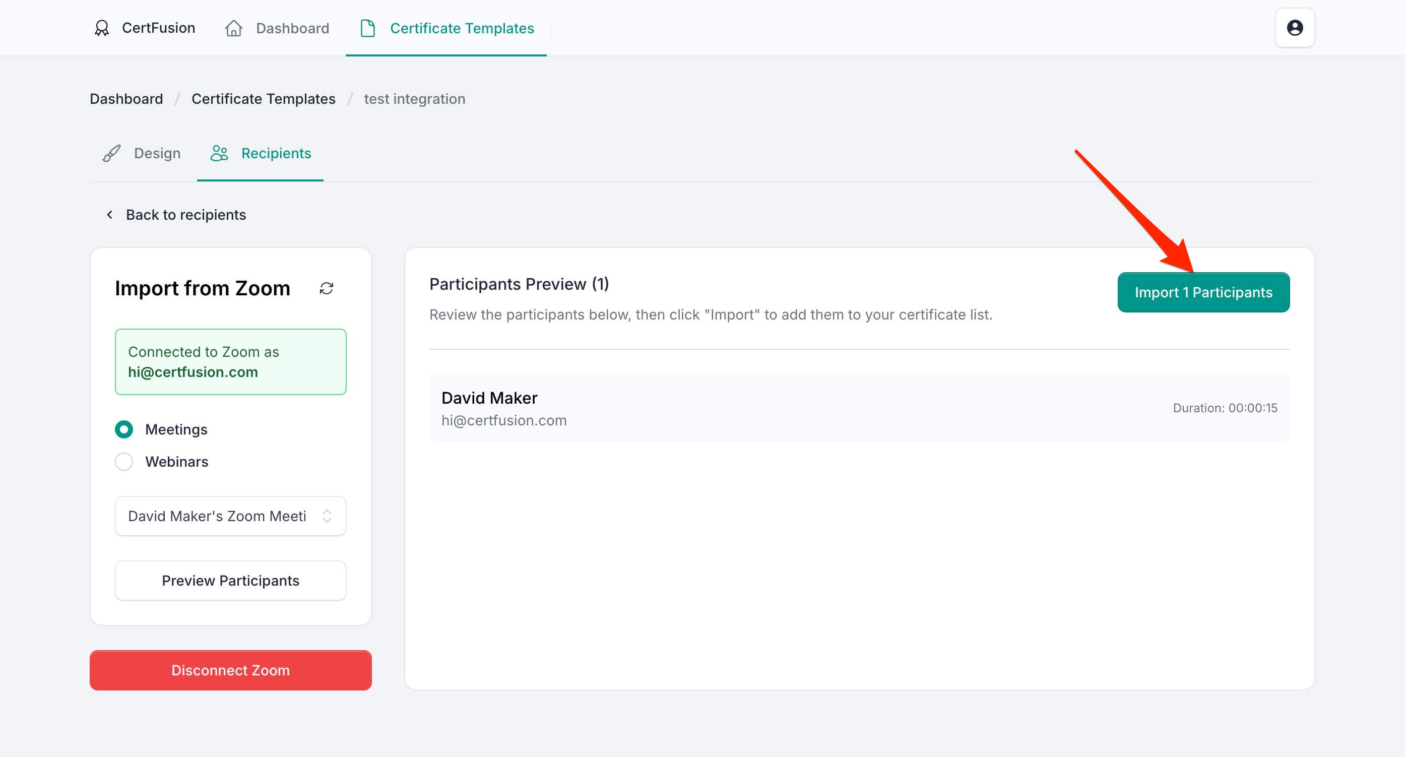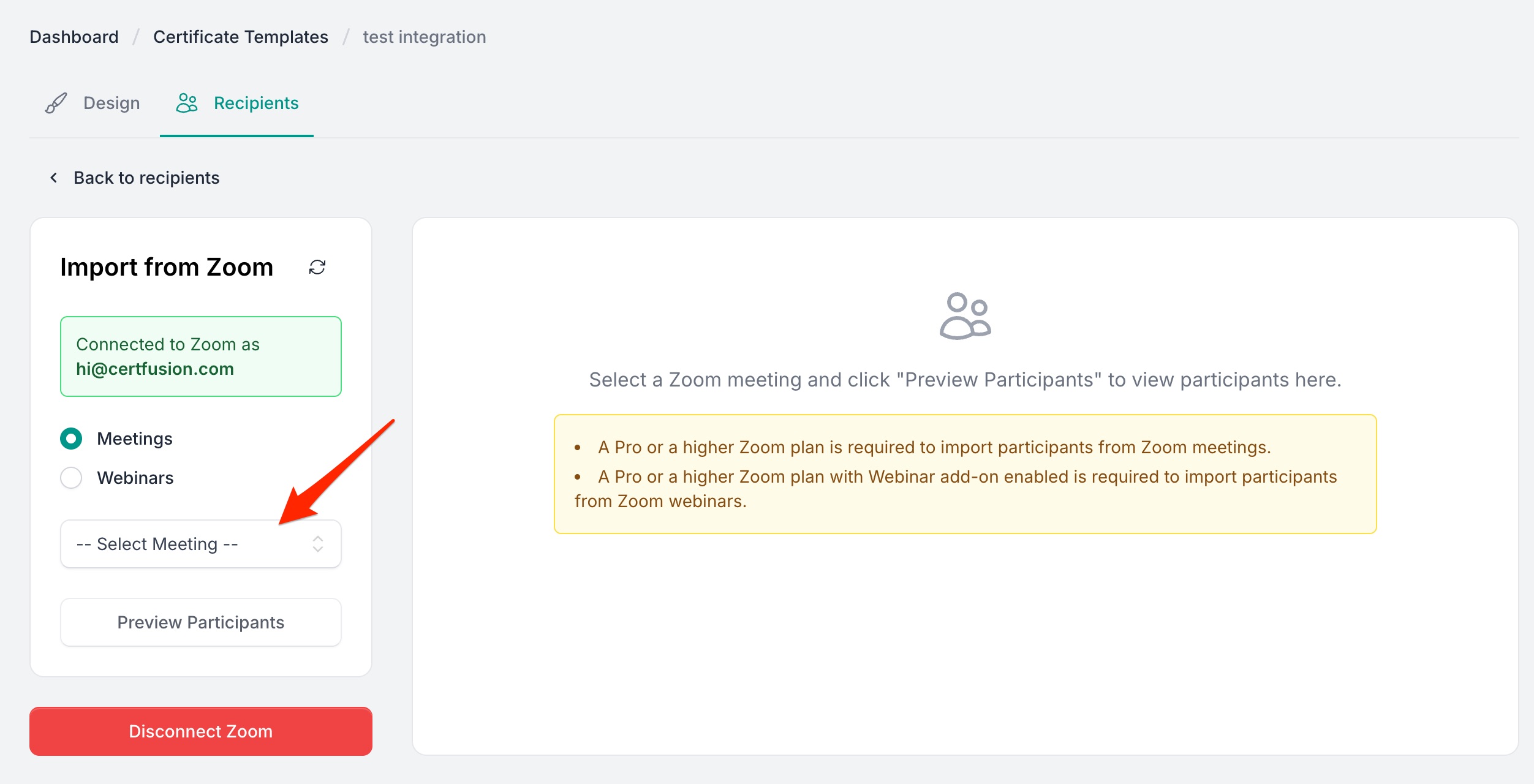 Connect your Zoom account to CertFusion and automate certificate delivery for your webinars and meetings. This guide walks you through installing the app, importing attendees, and removing the integration if needed.